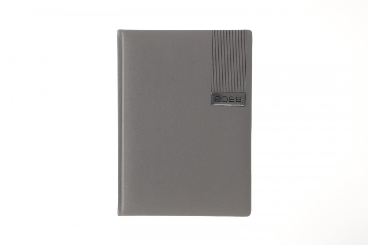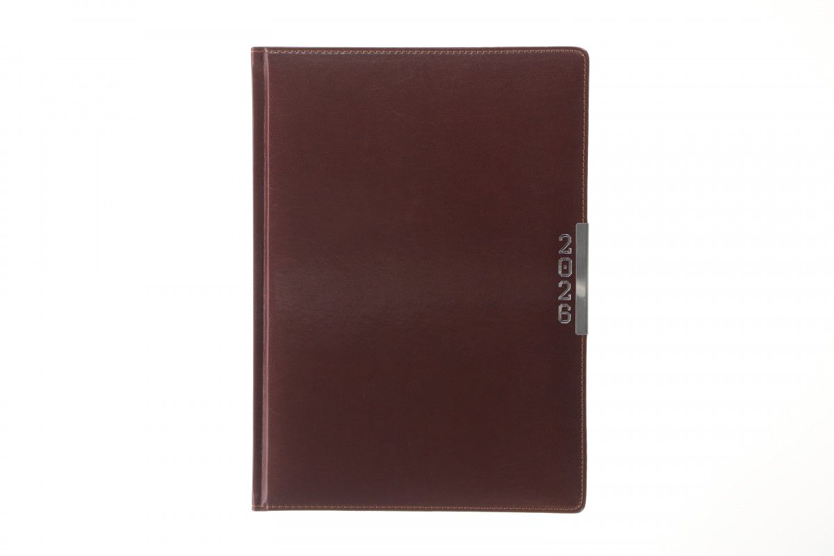 Kalendarz posiada rozbudowana część informacyjną oraz kolorowe mapy Polski i Europy. Bloki szyte nićmi, dwa kolory druku (szary-burgund). Oprawa na tekturze z gąbką, przeszywana, termoprzebarwialna, umożliwia wykonanie nadruków, głębokiego tłoczenia i personalizacji laserowej kalendarza. Posiada wstążkę kolorystycznie zharmonizowaną z okładką