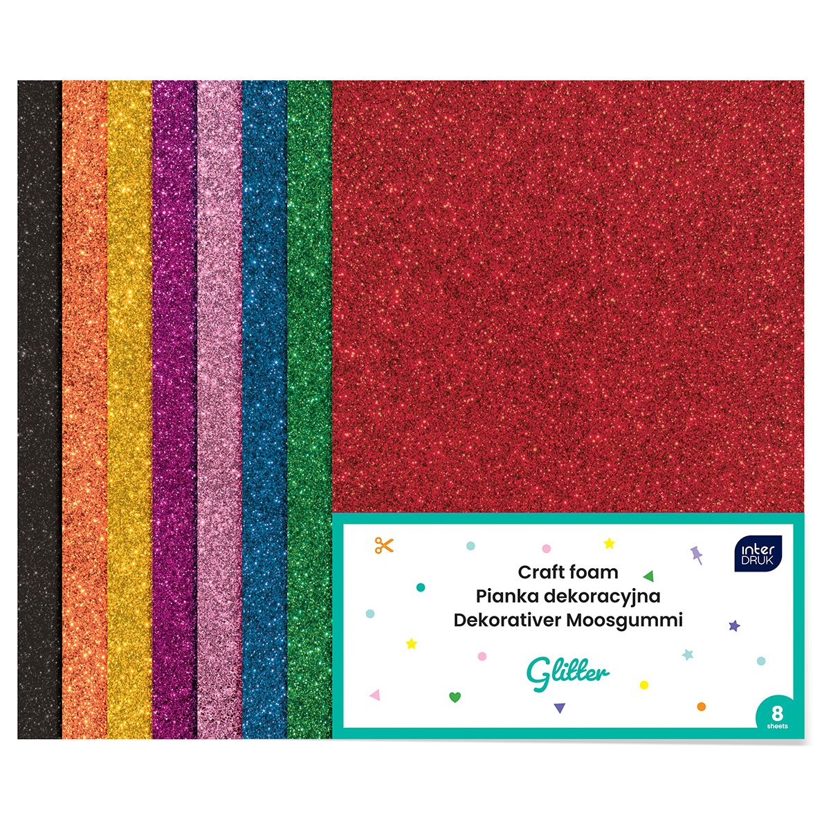 Opakowanie zawiera 8 arkuszy pianek w rozmiarze A4 jednostronnie pokrytych brokatem.