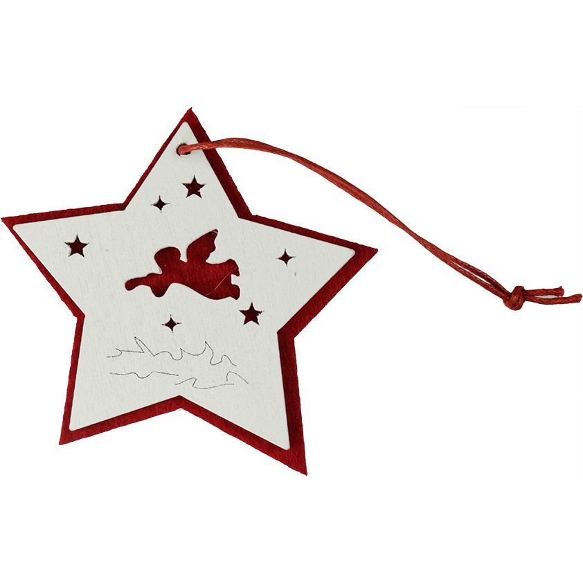 Zawieszki wykonane z połączenia filcu i drewna. Świetnie sprawdzą się w dekoracji okien, luster, świątecznych drzewek, wianków, świeczników a nawet prezentów. Kształt: gwiazdki z aniołem z trąbką, wymiary: 78 x 70 mm, kolor: białe drewno na czerwonym filcu. 3 szt.