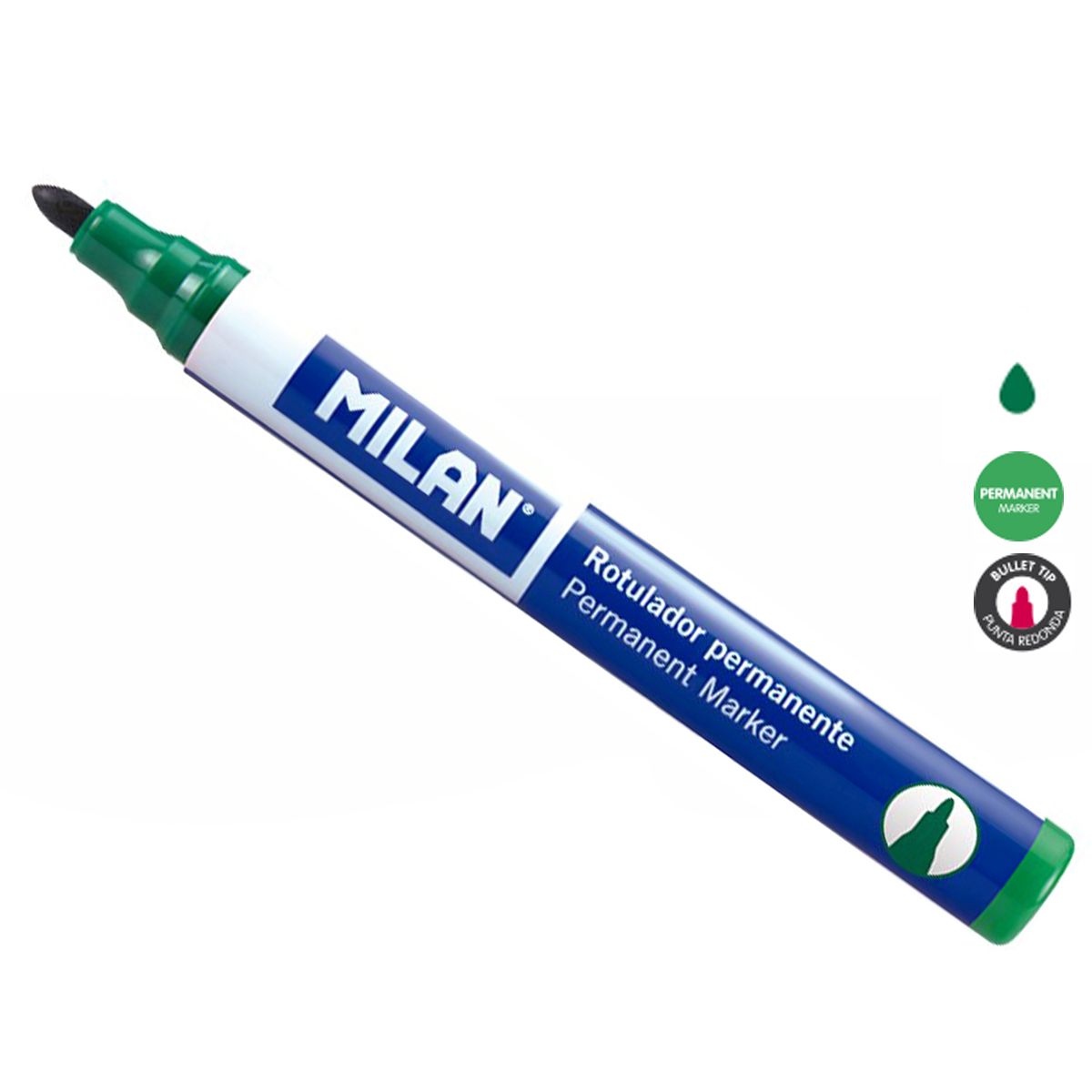 Zielone permanentne markery z okrągłą końcówką o średnicy 4 mm. Tworzą trwałe ślady na większości materiałów. Odporna końcówka, która jest w stanie wytrzymać uderzenia i silny nacisk. Nie odkształca się z upływem czasu. Tusz na bazie alkoholu. Zalecane: zakryć końcówkę po użyciu skuwką i przechowywać w pozycji poziomej. Rozmiar markera: 14,7 x ø 1,7 cm.