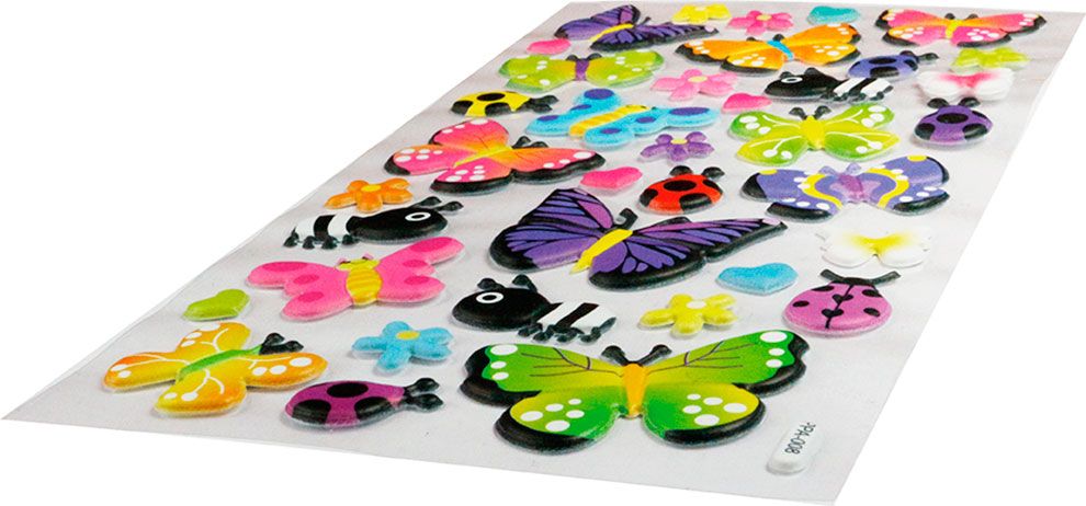 Naklejki wypukłe, wzór: motyle, biedronki, pszczółki. 37 sztuk.