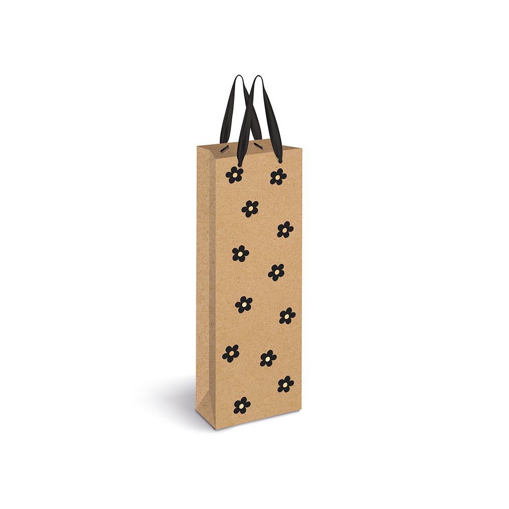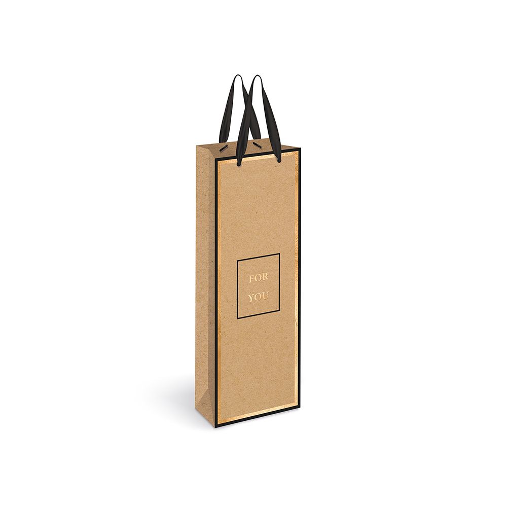 Wykonana z naturalnego, wytrzymałego papieru kraft 150 g. Wzmocniony, sztywny spód. Eleganckie i przyciągające wzrok, złote detale. Uchwyty wykonane z czarnego sznurka. Idealna do szybkiego i efektownego pakowania prezentów. Wymiary: 13x36x8 cm.