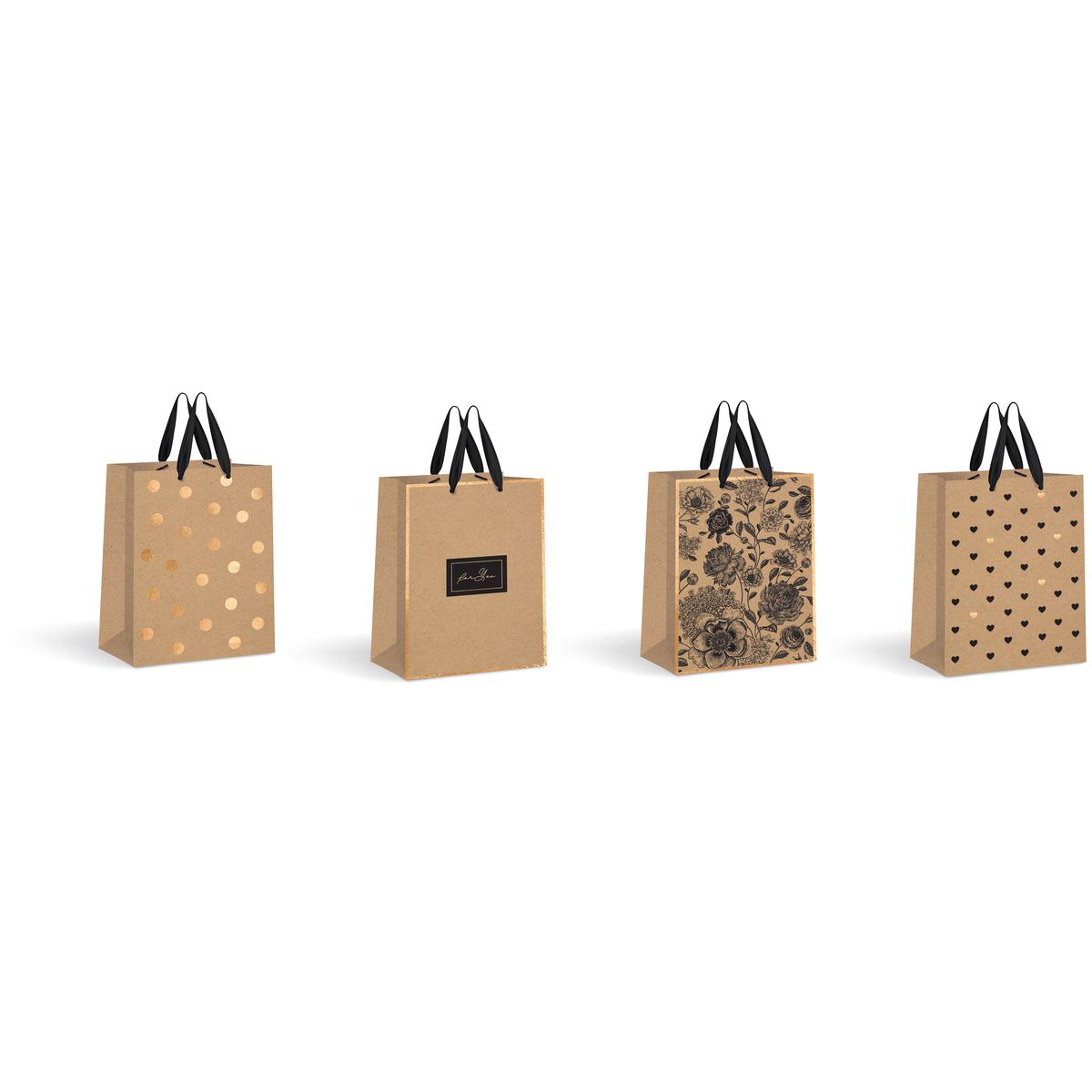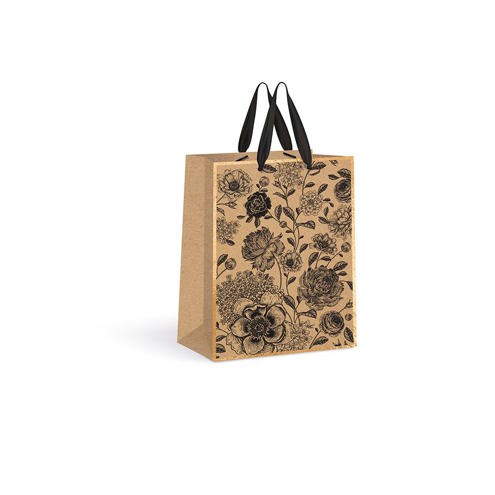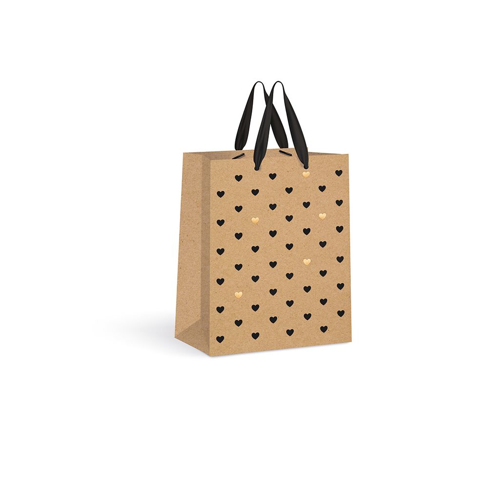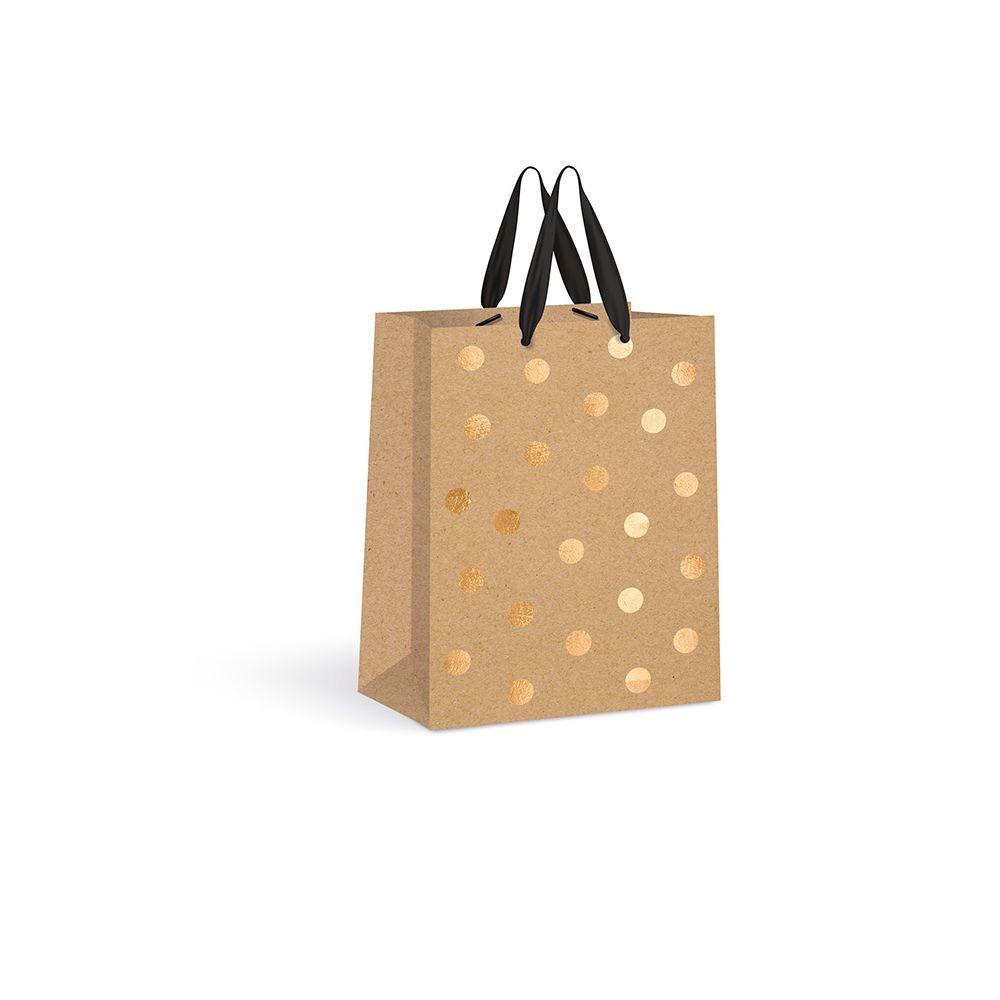 Wykonana z naturalnego, wytrzymałego papieru kraft 150 g. Wzmocniony, sztywny spód. Eleganckie i przyciągające wzrok, złote detale. Uchwyty wykonane z czarnego sznurka. Idealna do szybkiego i efektownego pakowania prezentów. Wymiary: 33x46x10 cm.