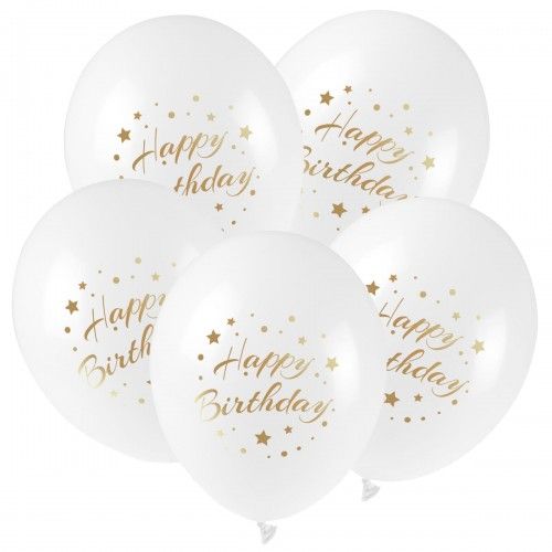 Balon gumowy ze złotym nadrukiem Happy Birthday (5 szt.) biały 300mm 12cal Arpex (KB2877)