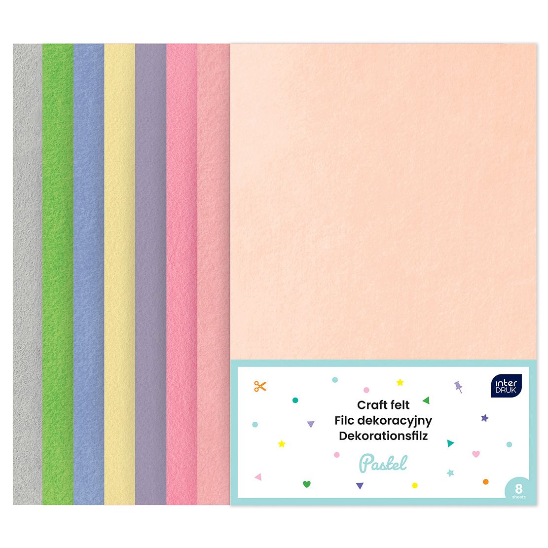 Opakowanie zawiera 8 arkuszy filców w rozmiarze A4 w pastelowych kolorach.