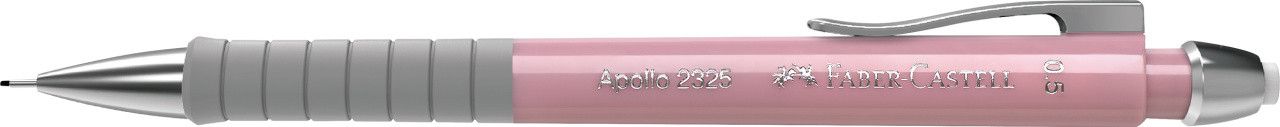 Ołówek automatyczny Apollo Faber-Castell w kolorze różowym. Nowoczesny ołówek do pisania i szkicowania. Wysoce ergonomiczny, dzięki antypoślizgowej, gumowej strefie uchwytu. Wyposażony w technologię amortyzującą grafit dla ochrony przed łamaniem. Chowana osłona grafitu. Ze zintegrowaną gumką i metalowym klipsem. Średnica grafitu: 0,5 mm.