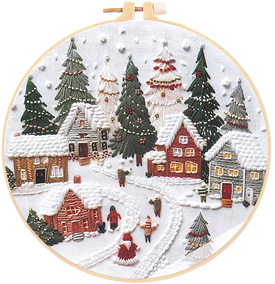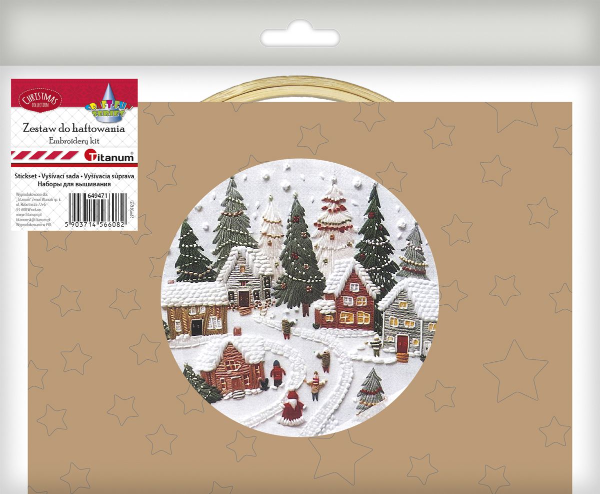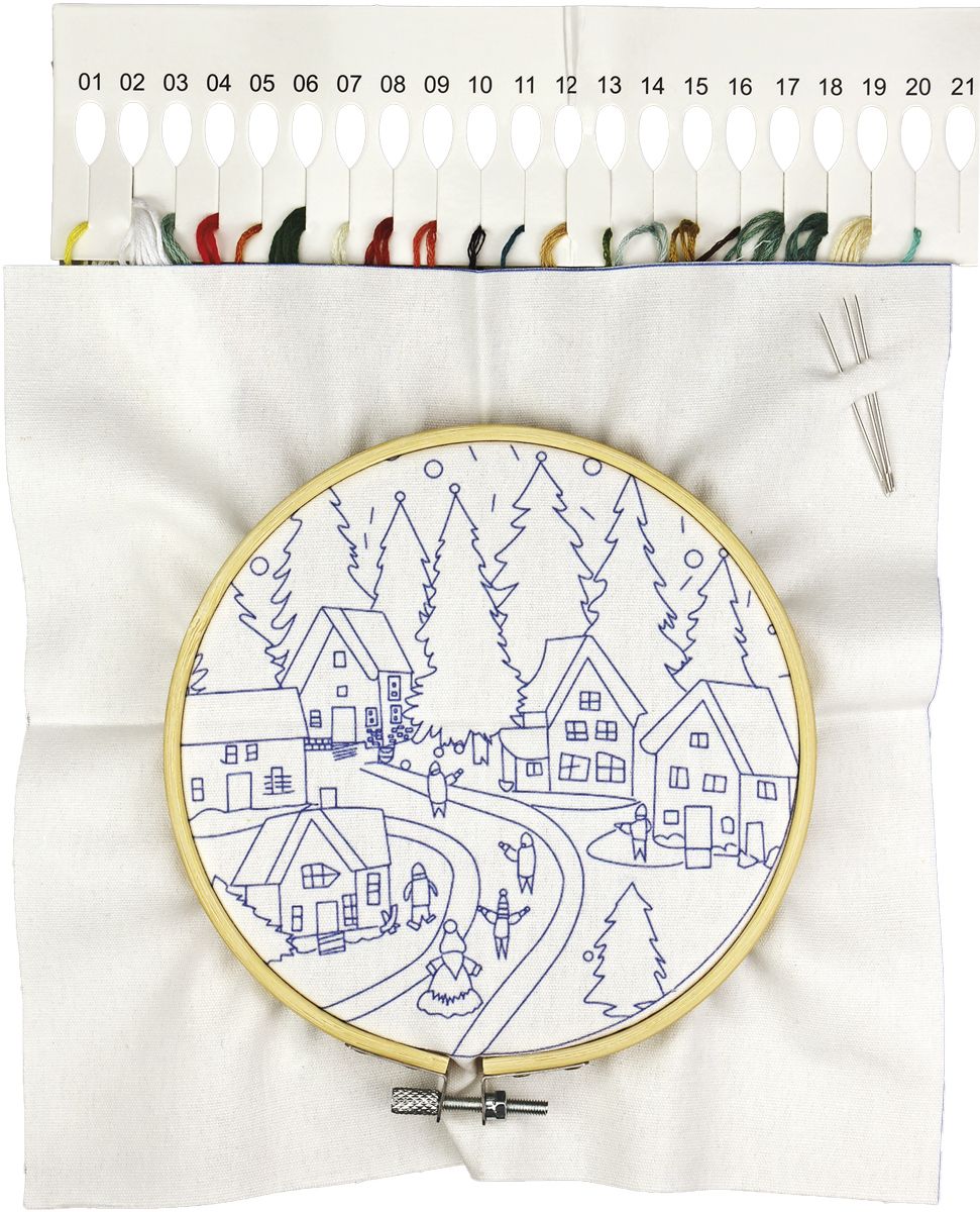 Gotowy zestaw do haftowania, zawierający: tkaninę 24x24 cm ze szkicem wzoru, tamborek o średnicy roboczej 15 cm, zestaw mulin, 3 igły, instrukcję w języku polskim. Wzór: świąteczna wioska.