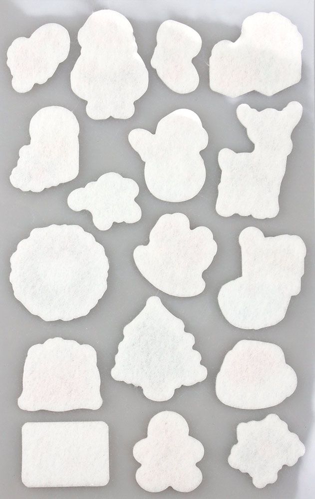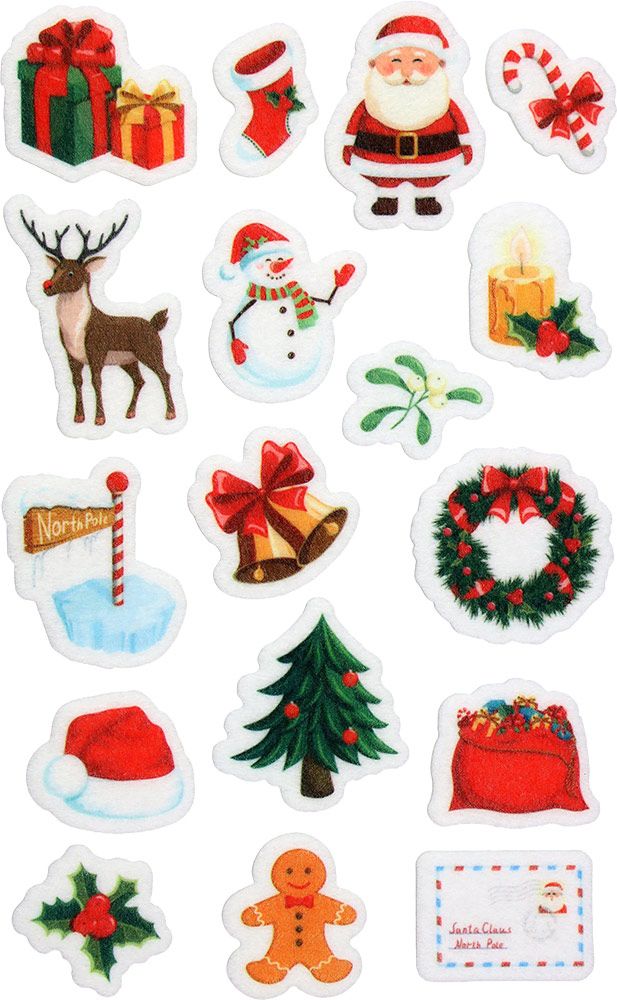 Naklejki filcowe, wzory: Mikołaj, renifer, choinka, wianek, bałwanek, prezent, list, bombkii. Mix rozmiarów i kolorów. 9 sztuk.