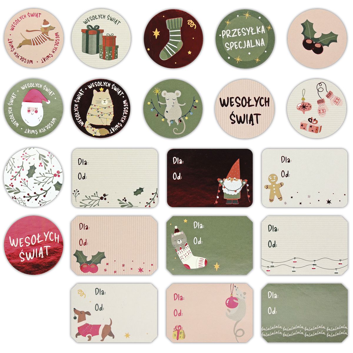 Naklejki papierowe, wzór: okrągłe, etykiety prezentowe. 21 sztuk.