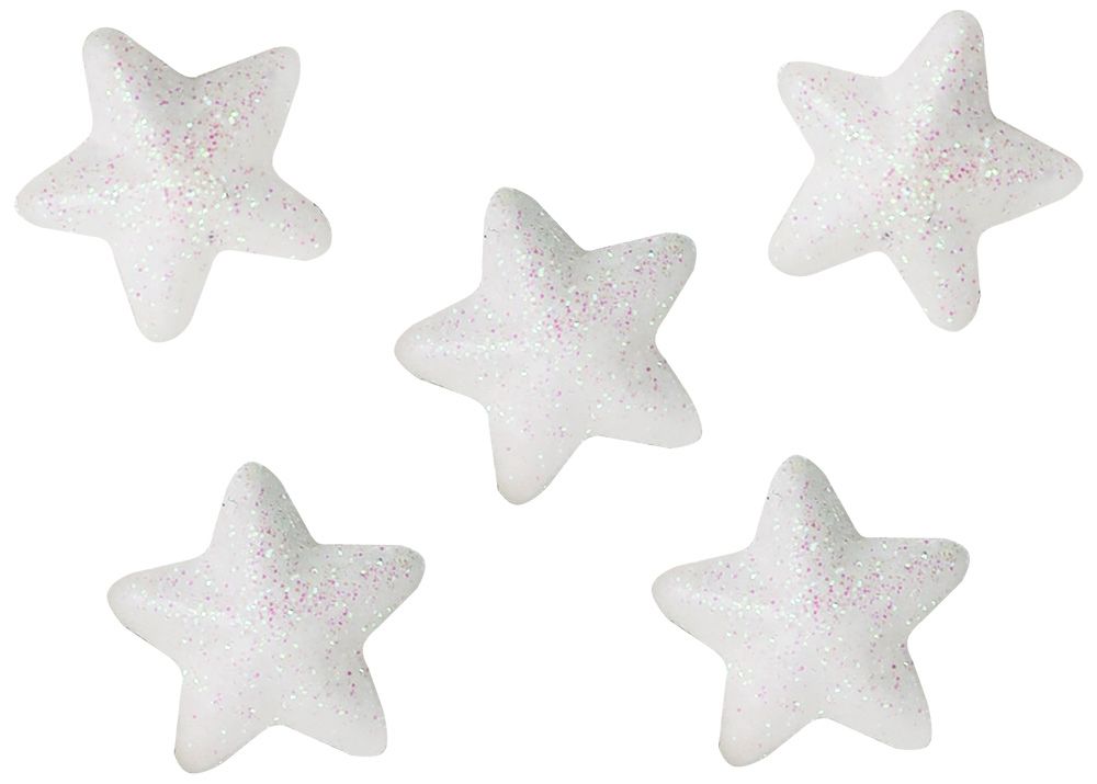 Styropianowe gwiazdki, wymiary: 20x18 mm, grubość: 10 mm, brokatowe srebrne. 60 sztuk.