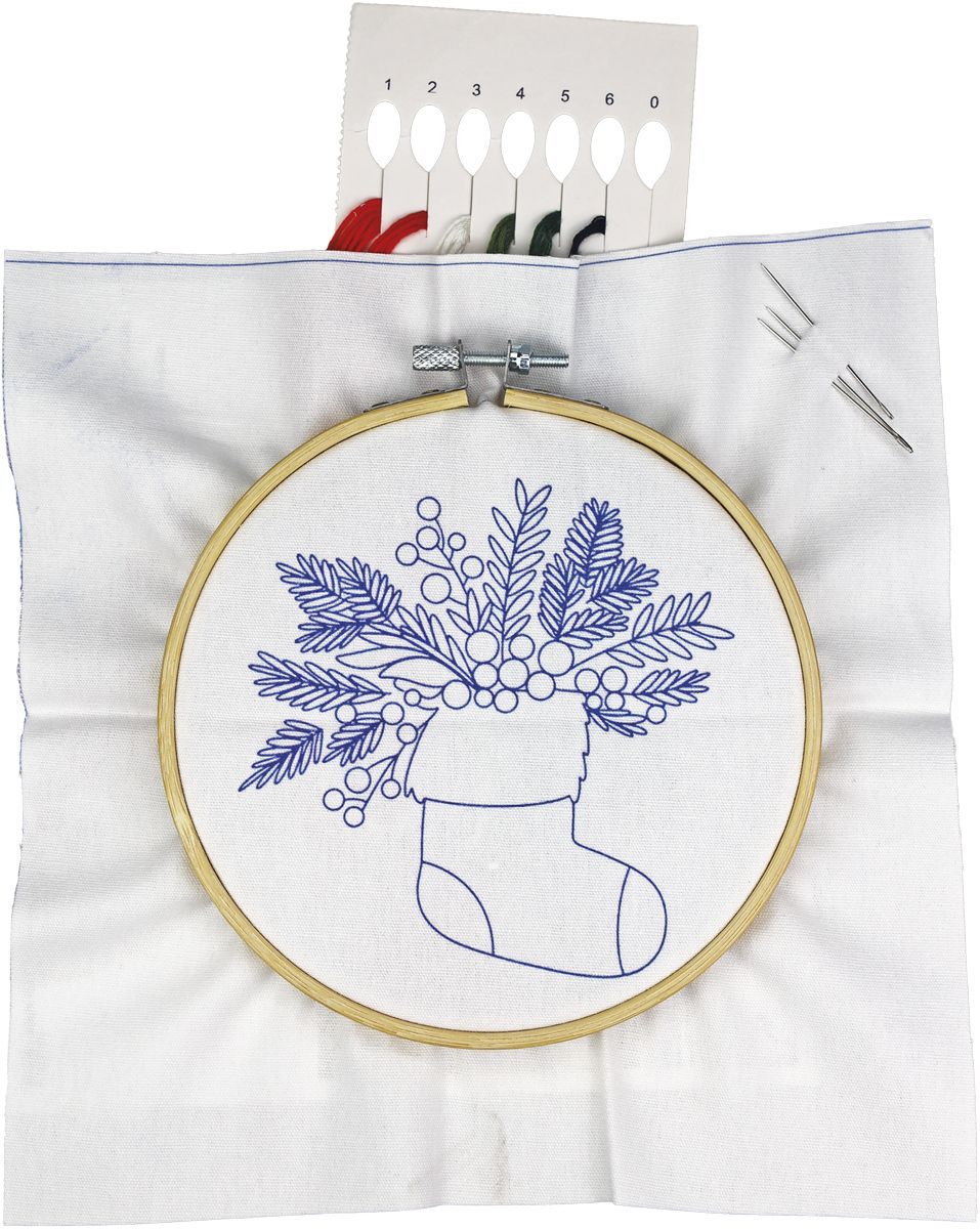 Gotowy zestaw do haftowania, zawierający: tkaninę 24x24 cm ze szkicem wzoru, tamborek o średnicy roboczej 15 cm, zestaw mulin, 3 igły, instrukcję w języku polskim. Wzór: świąteczna skarpeta.