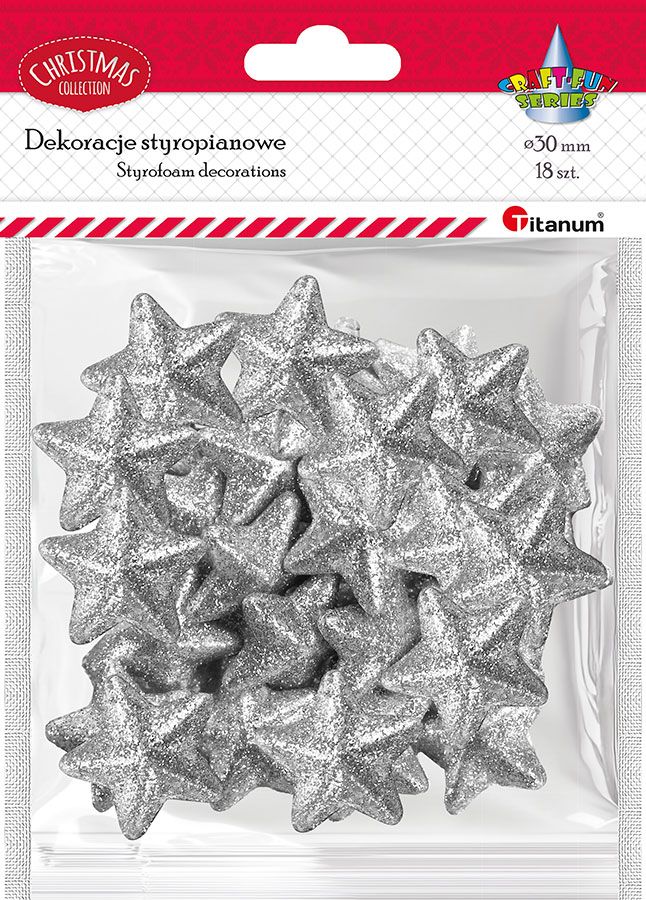 Styropianowe gwiazdki, wymiary: 30x28 mm, grubość: 10 mm, brokatowe srebrne. 18 sztuk.