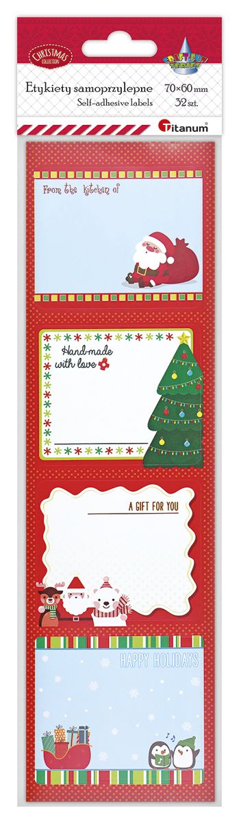 Etykiety samoprzylepne, wzory: Boże Narodzenie, wymiar etykiety: 70x60 mm, 8 plansz, 32 sztuki.
