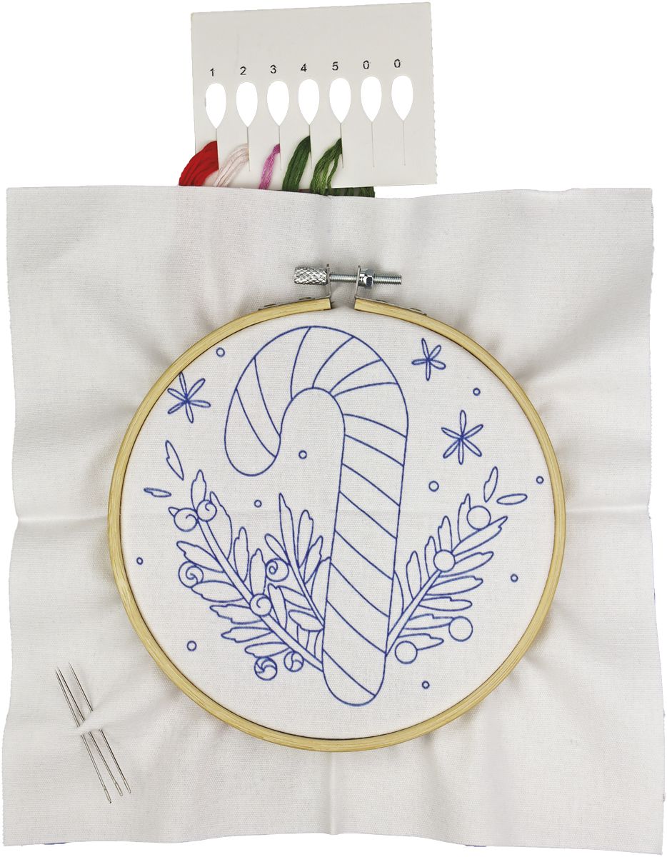 Gotowy zestaw do haftowania, zawierający: tkaninę 24x24 cm ze szkicem wzoru, tamborek o średnicy roboczej 15 cm, zestaw mulin, 3 igły, instrukcję w języku polskim. Wzór: cukrowa laska.