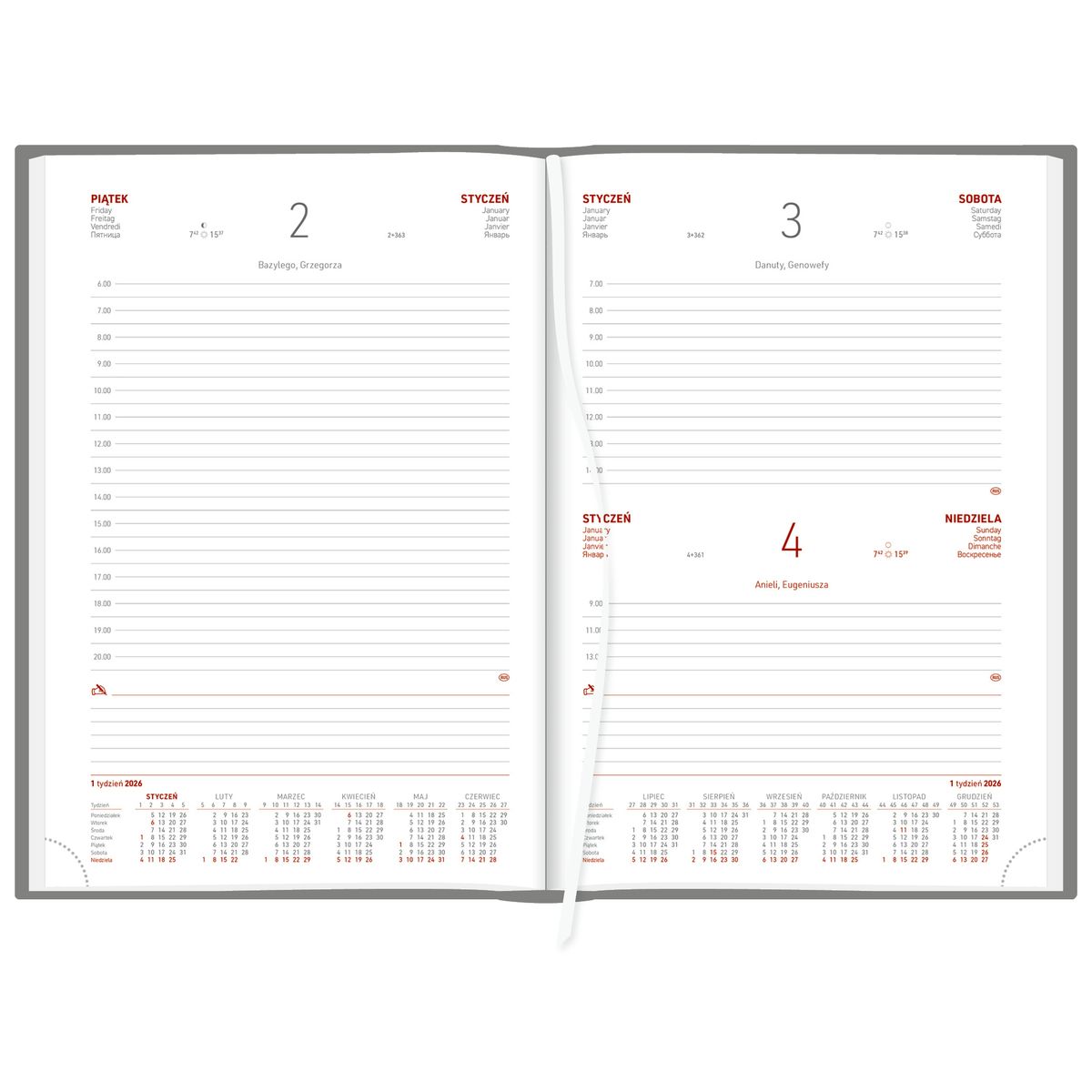 Kalendarz drukowany na białym papierze bloki terminarza szyte nićmi kapitałka i tasiemka białe przejrzysty układ graficzny kalendarium rozbudowana część informacyjna oprawa umożliwia wykonanie nadruków, tłoczenia i personalizacji kalendarza.