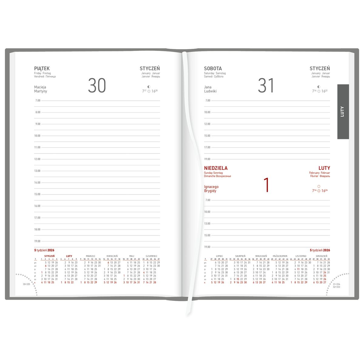 Kalendarz drukowany na białym papierze; bloki terminarza szyte nićmi; kapitałka i tasiemka białe; przejrzysty układ graficzny kalendarium; rozbudowana część informacyjna.