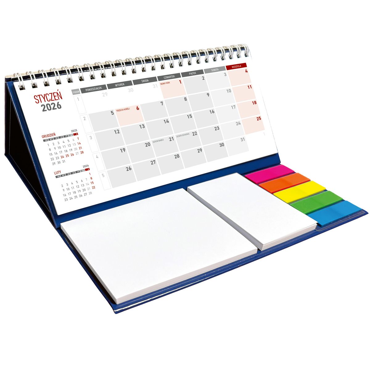 Wygodny kalendarz stojący na biurko z przejrzystym kalendarium w układzie miesięcznym z poręcznymi karteczkami samoprzylepnymi do notowania. Przydatny zwłaszcza w biurze. W kalendarzu zaznaczono święta. Kalendarium spiralowane.