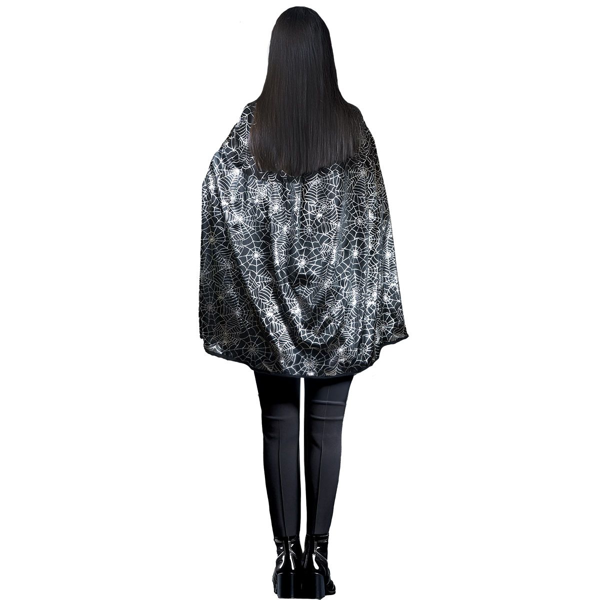 Peleryna z nadrukiem pajęczyn to uniwersalny dodatek do halloweenowych przebrań i tematycznych stylizacji. Wykonana z lekkiego materiału, ozdobiona połyskującym wzorem, idealna dla czarownicy, wampira, ducha lub tajemniczej postaci. Zawiązywana pod szyją, wygodna do noszenia zarówno przez dzieci, jak i dorosłych.