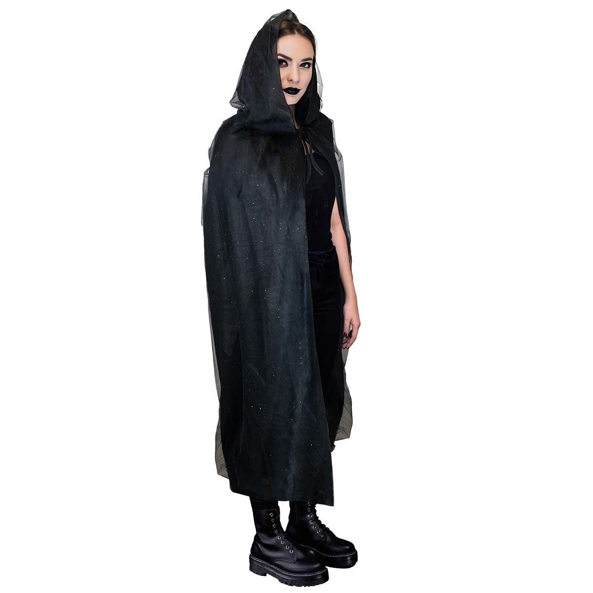 Stylowa peleryna z kapturem to efektowny dodatek do halloweenowych przebrań i wieczornych stylizacji. Uszyta z dwóch warstw materiału – kryjącej bazowej oraz prześwitującej zewnętrznej, na której znajdują się subtelne drobinki brokatu, które delikatnie połyskują przy ruchu i świetle.