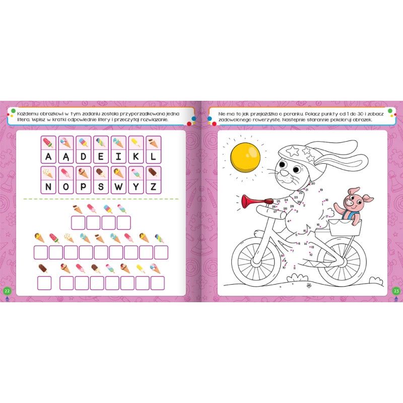 Książeczka z urozmaiconymi łamigłówkami dostosowanymi do możliwości 6-letniego dziecka przyniesie małemu czytelnikowi radość z dobrej zabawy i satysfakcję z samodzielnie wykonanych zadań. Krzyżówki, labirynty, łączenia punktów, ukryte hasła i obrazki oraz inne łamigłówki będą znakomitym treningiem logicznego myślenia, a atrakcyjna szata graficzna dodatkowo zwiększy przyjemność korzystania z książki.