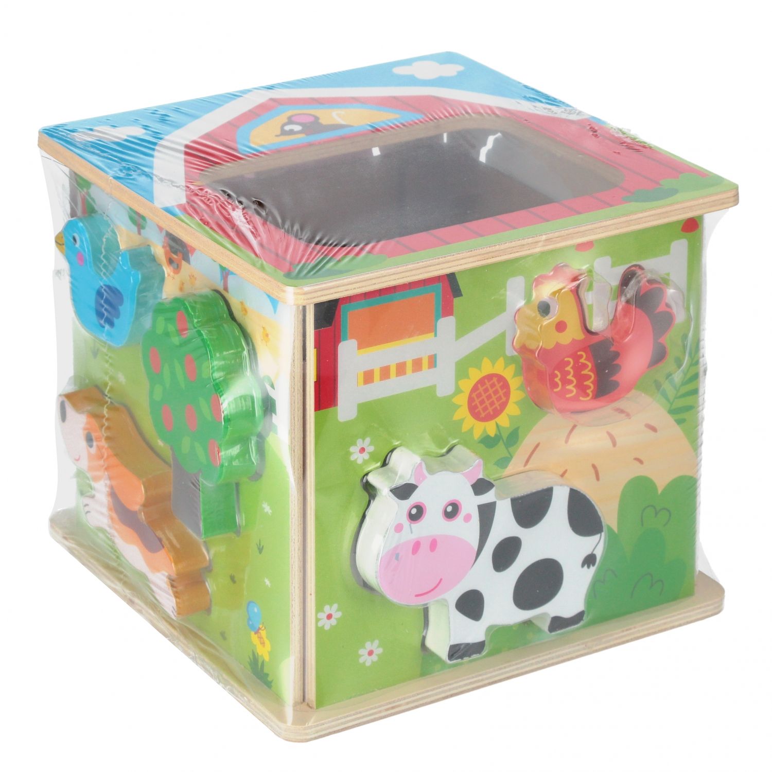 Zabawka drewniana, kostka sorter z figurkami zwierząt z farmy, jest doskonałym narzędziem do nauki oraz zabawy dla małych dzieci, zachęcając do eksploracji i nauki poprzez interakcję z różnorodnymi kształtami i kolorami.