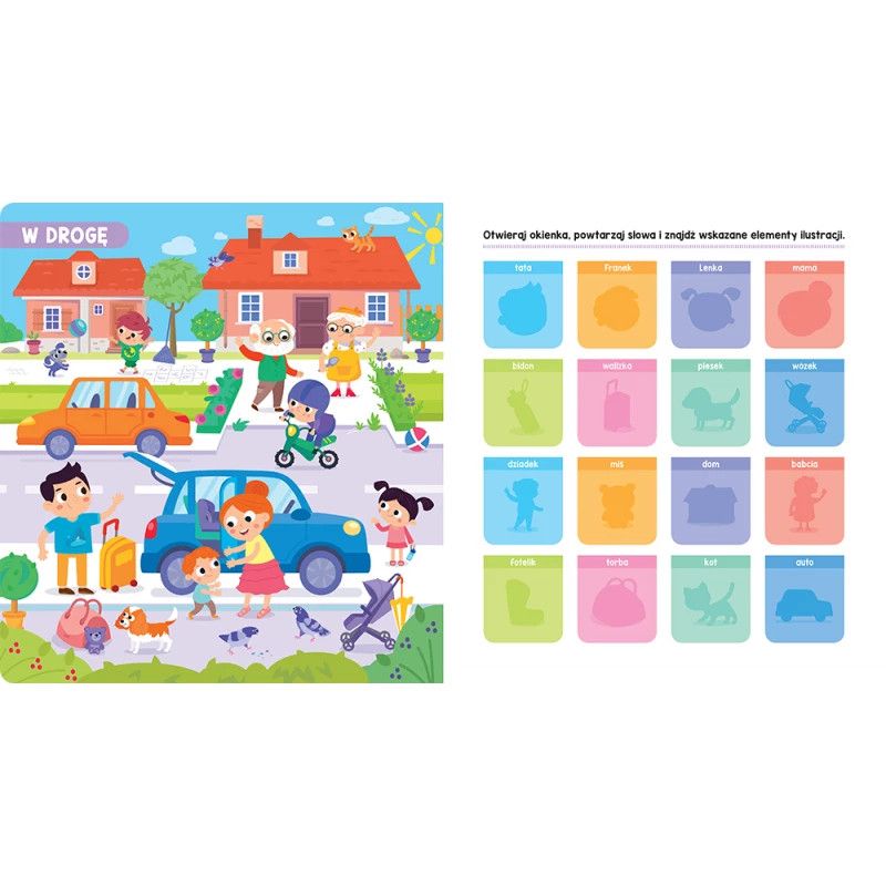 Ponad 100 okienek w książeczce gwarantuje małym odkrywcom udaną zabawę z niespodziankami. Z tą książką dzieci poznają nazwy związane z pakowanie do podróży, przejazdem autostradą i przez wiejskie bezdroża, nazwy pojazdów ratunkowych wykorzystywanych do pomocy w trakcie wypadku drogowego, słownictwo związane z wypoczynkiem na kempingu, wizytą w porcie i na lotnisku