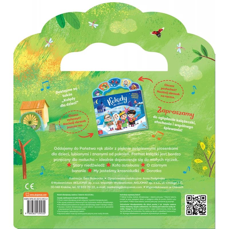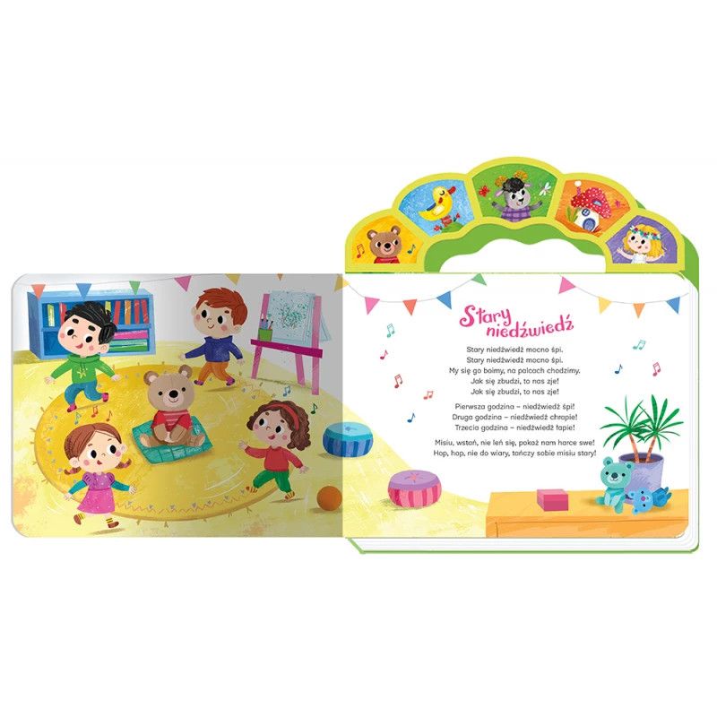 Oddajemy do Państwa rąk zbiór z pięknie zaśpiewnymi piosenkami dla dzieci, lubianymi i znanymi od pokoleń. Format książki jest bardzo poręczny dla malucha – idealnie dopasowuje się do małych rączek. Kolorowe ilustracje oraz teksty każdej z piosenek zachęcą dziecko do wspólnego śpiewania. Teksty otoczone są kolorowymi ilustracjami, nawiązującymi do treści piosenek, często je uzupełniają, a co najważniejsze – zachęcają do wspólnej zabawy. Piosenkę można włączyć, naciskając obrazek na rączce – jeden obrazek odpowiada jednej piosence. W każdej chwili można wyłączyć grającą melodię, ponownie naciskając obrazek. Książka działa na baterie, które można wyjąć i wymienić. Istnieje również możliwość wyłączenia grających piosenek, przesuwając guzik przy baterii. Książka sprawdzi się dla dzieci w każdym wieku. Młodsze mogą tylko słuchać piosenek, starsze dzieci mogą przeczytać tekst i śpiewać równocześnie z nagraniem.