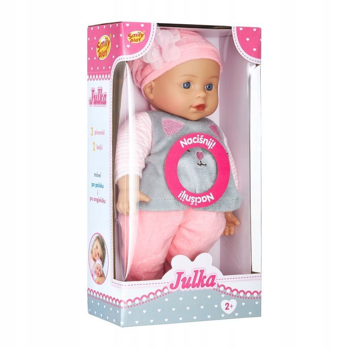 Interaktywna lalka Julka to uroczy bobas, który potrafi mówić, śpiewać i opowiadać bajki w dwóch językach – po polsku i po angielsku. Jej miękkie, przytulne ciało zachęca do noszenia i tulenia, a realistyczne rysy twarzy sprawiają, że wygląda jak prawdziwe niemowlę. Wystarczy nacisnąć brzuszek, aby usłyszeć jedną z wielu kwestii, piosenek lub bajek, co zapewnia dziecku nie tylko zabawę, ale i naukę nowych słów. Lalka ma na sobie różowo-szary strój z motywem kotka oraz czapeczkę z ozdobnym kwiatuszkiem, które nadają jej wyjątkowego uroku. Śpiewa trzy wesołe piosenki, opowiada dwie klasyczne bajki („Złotowłosa i trzy misie” oraz „Czerwony Kapturek”) i zachęca do wspólnej zabawy, tańca czy ćwiczeń. Dzięki funkcji dwujęzycznej, maluchy mogą w naturalny sposób przyswajać podstawy języka angielskiego. Julka jest doskonałym wyborem na prezent dla dzieci od 2. roku życia. Rozwija wyobraźnię, uczy empatii i wspiera rozwój mowy, jednocześnie zapewniając godziny radosnej zabawy. W zestawie znajdują się baterie, dzięki czemu lalka jest gotowa do zabawy od razu po rozpakowaniu.