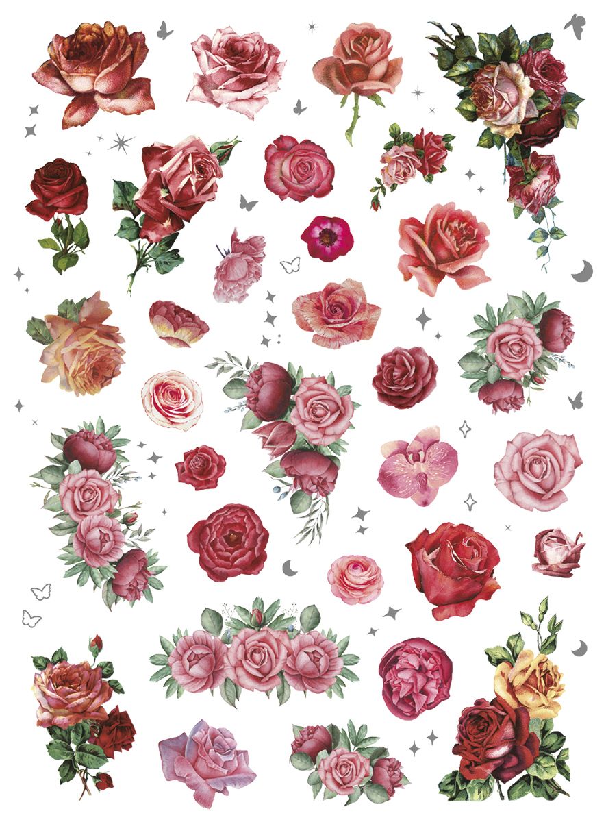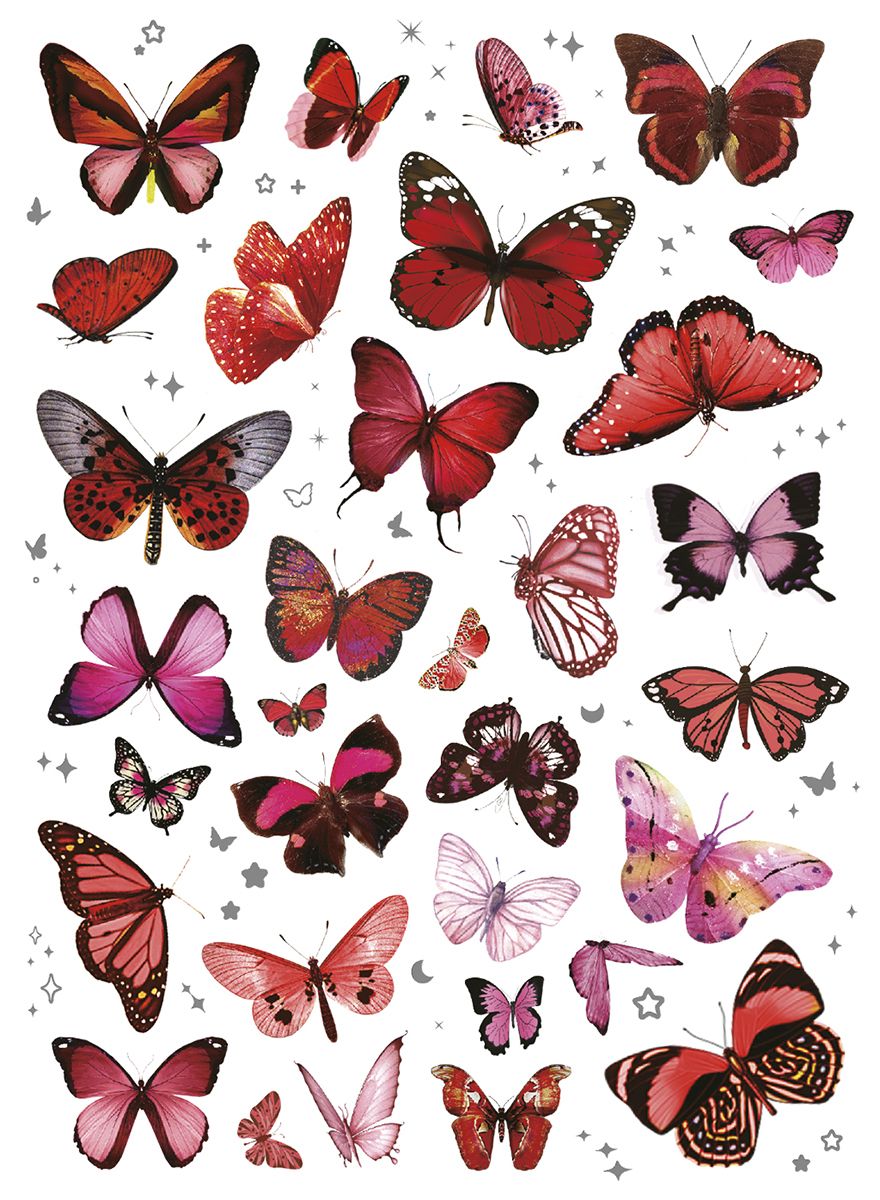 Naklejki foliowe, 2 plansze, wzory: motyle, kwiaty, tonacja czerwona.