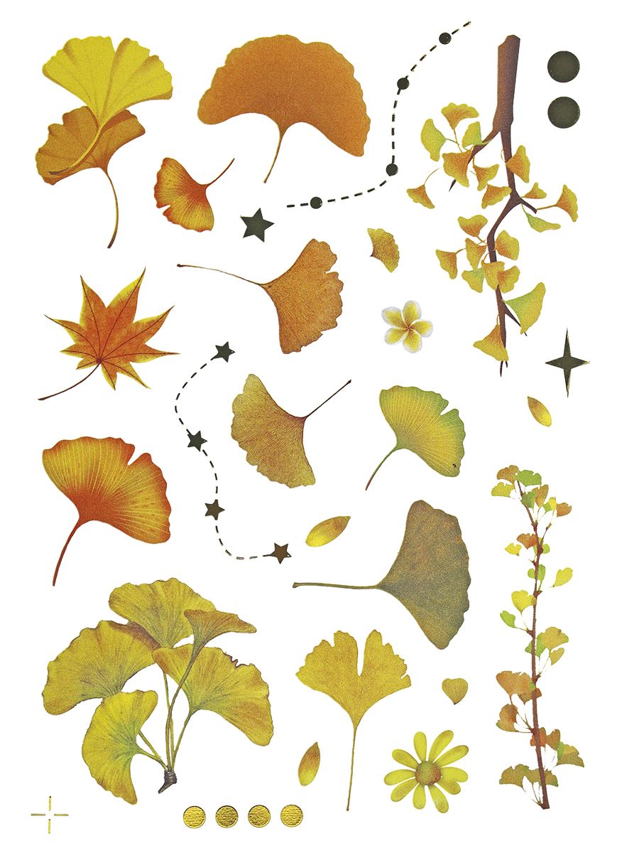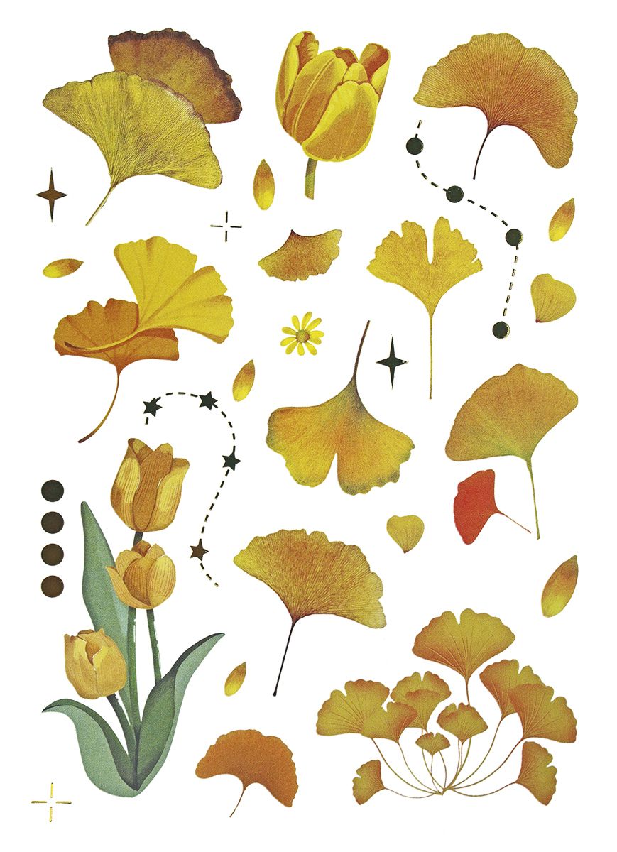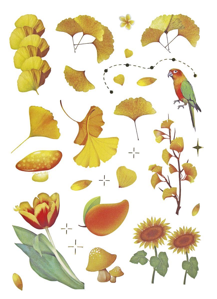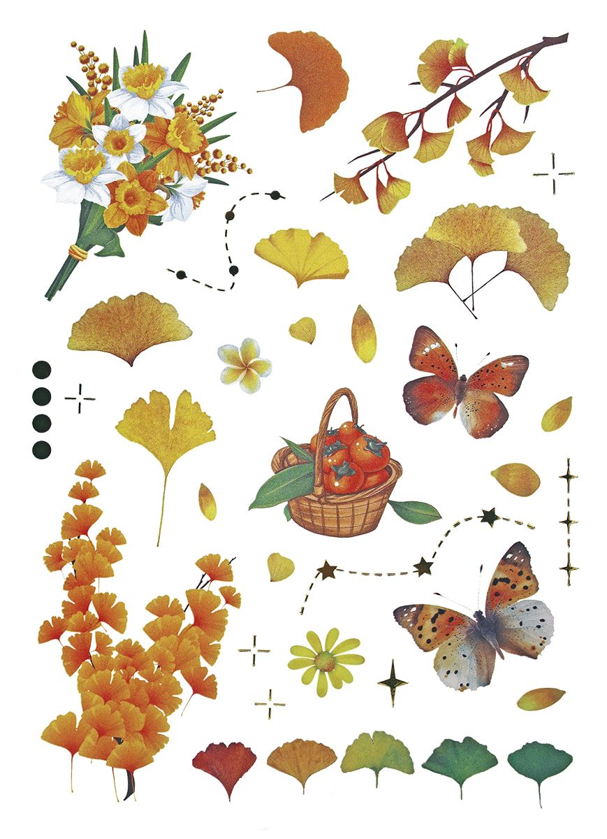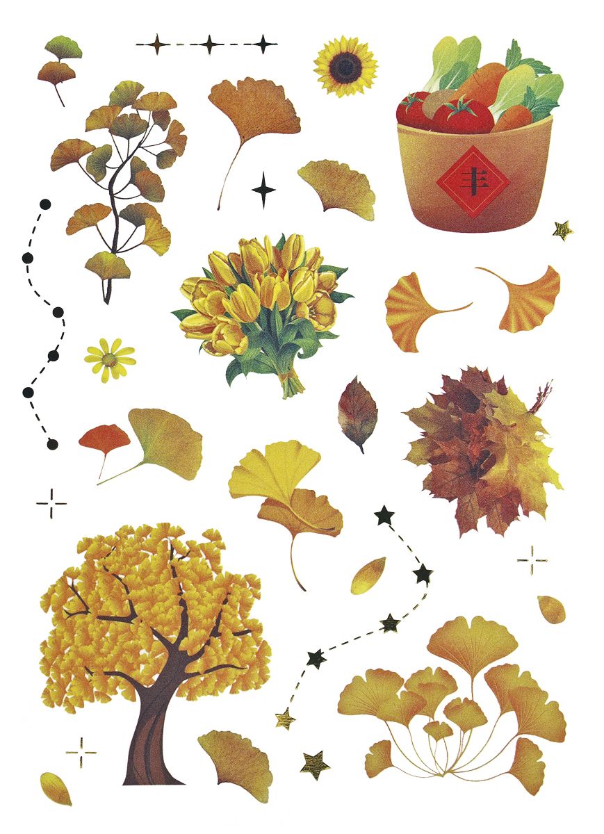 Naklejki foliowe, 8 plansz, wzory: liście, kwiaty, kosze z warzywami.
