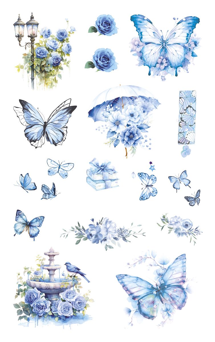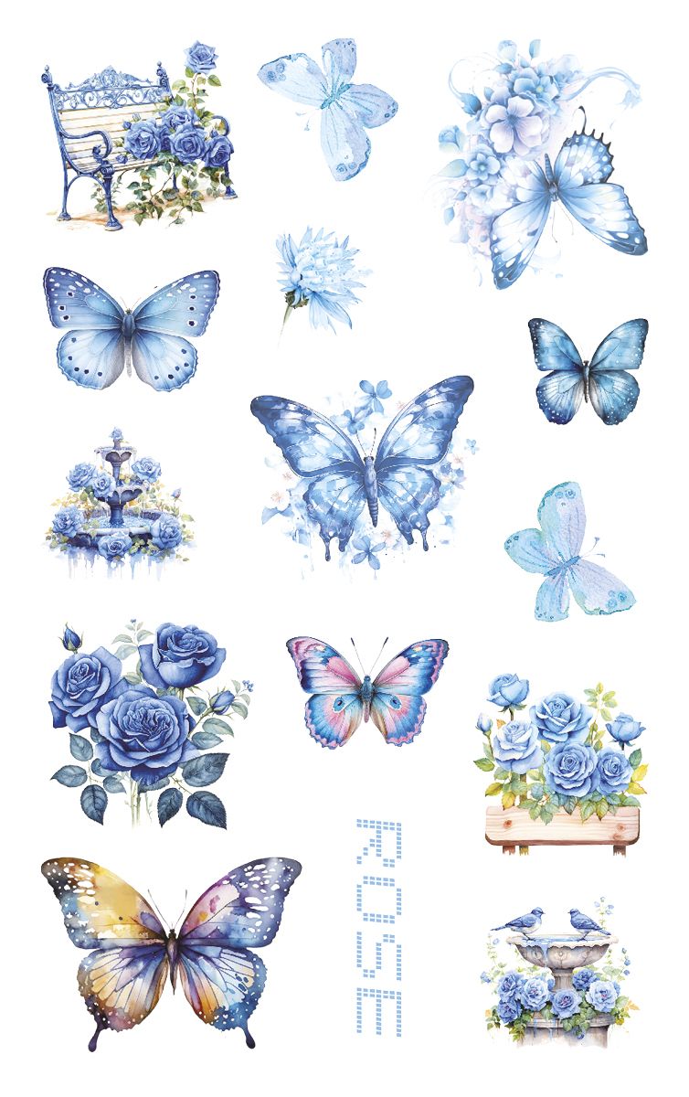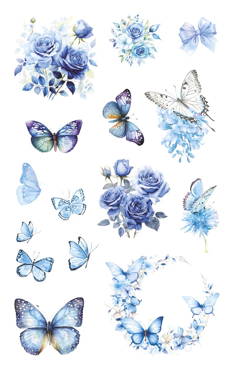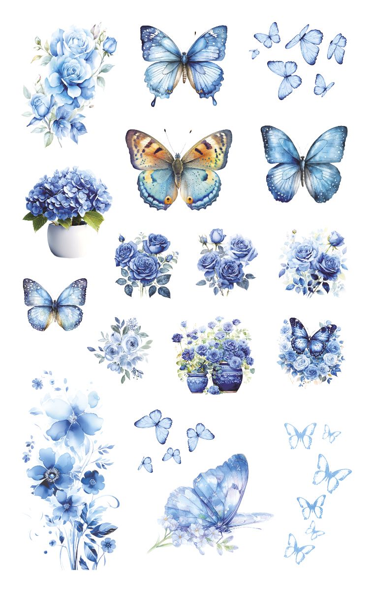 Naklejki foliowe, 4 plansze, wzory: motyle, kwiaty. tonacja niebieska.