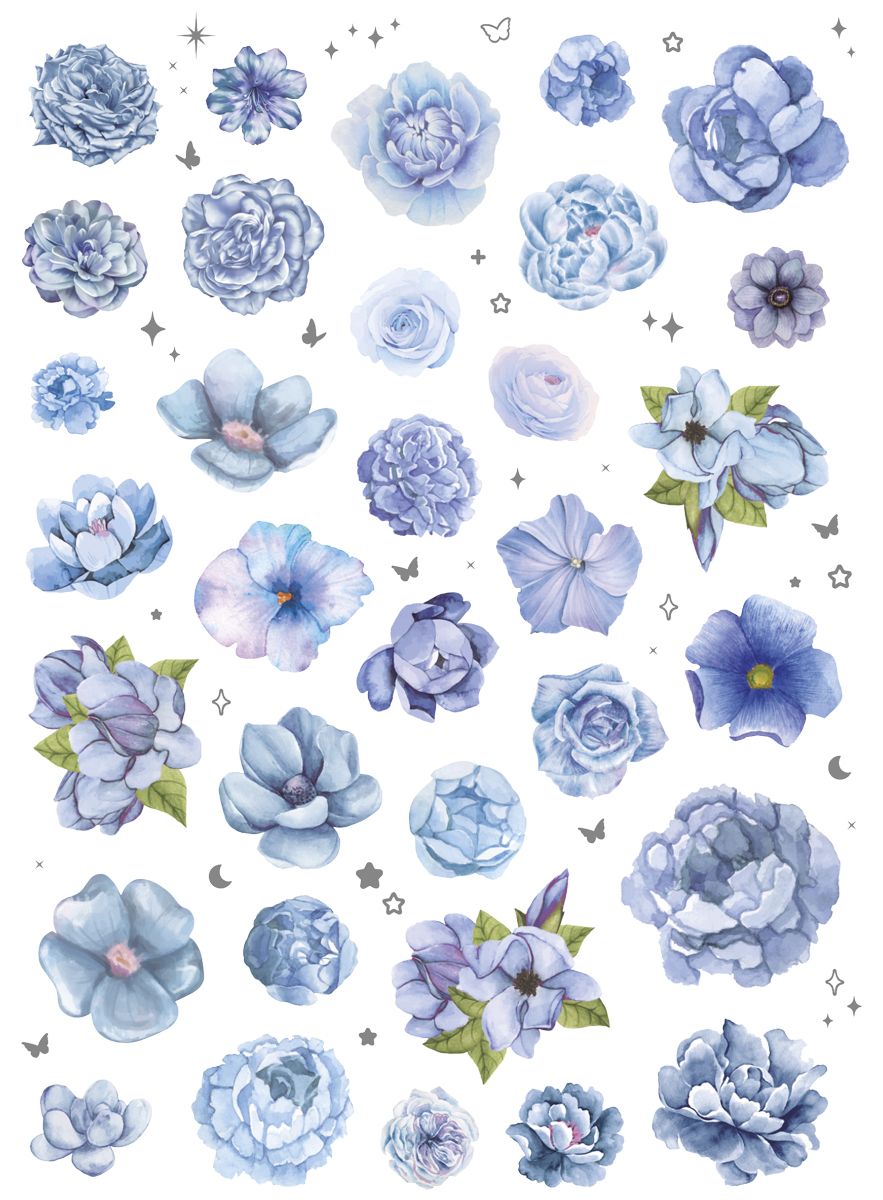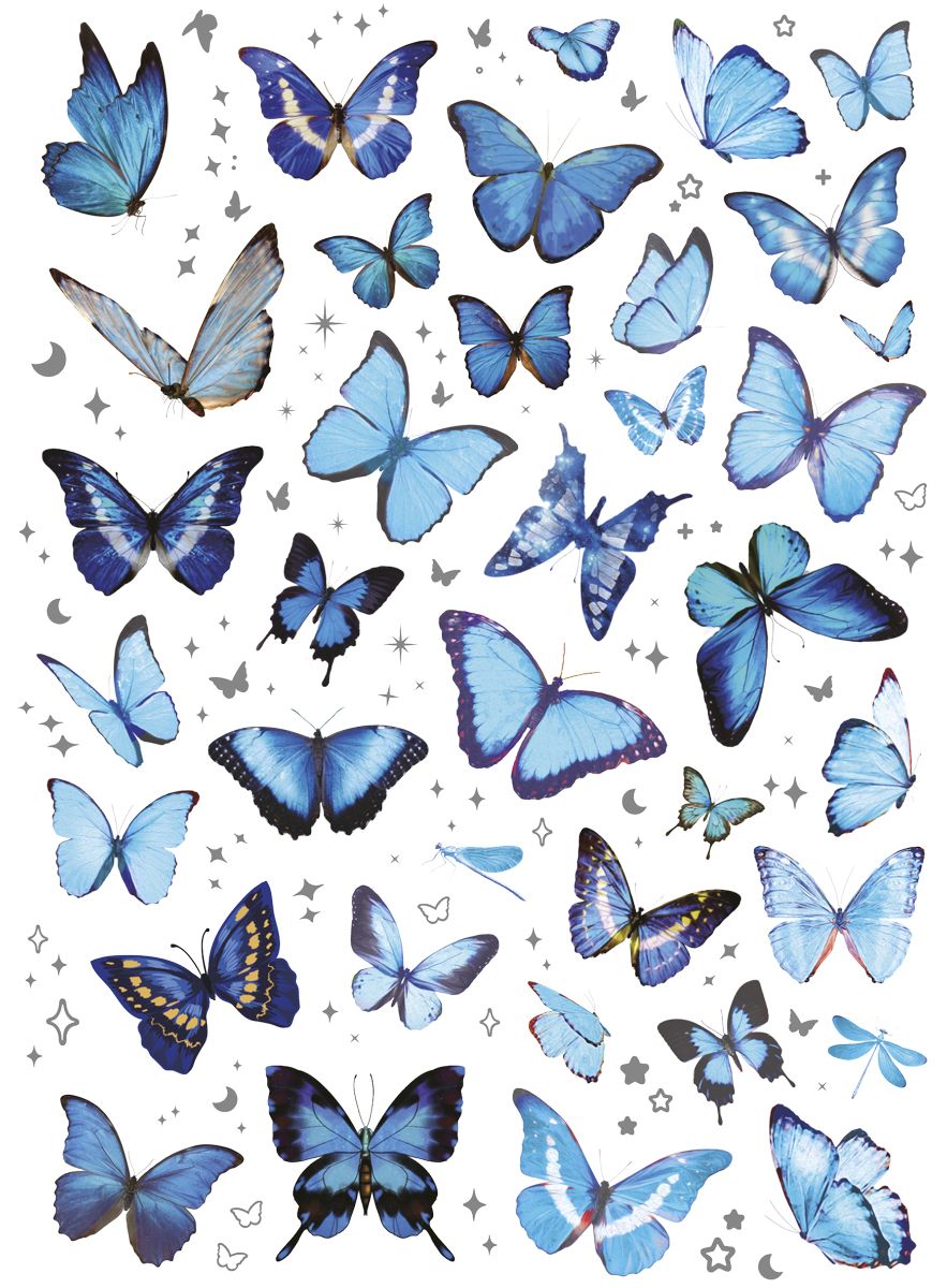 Naklejki foliowe, 2 plansze, wzory: motyle, kwiaty, tonacja niebieska.