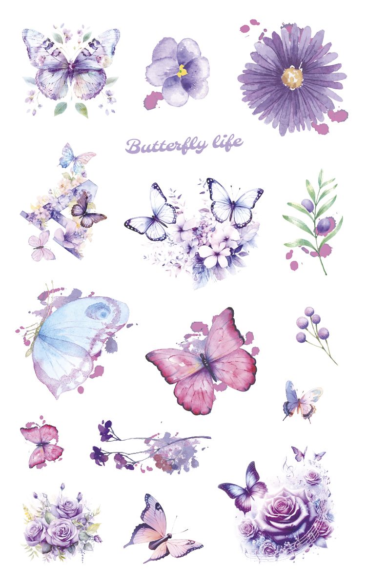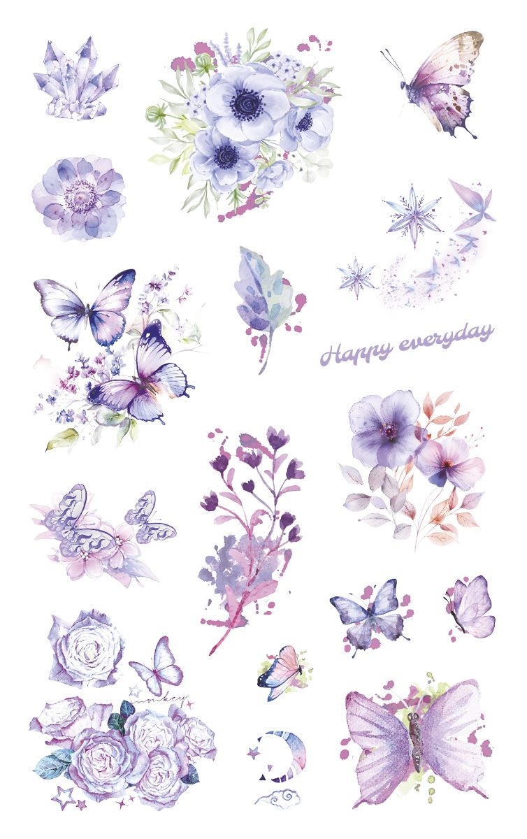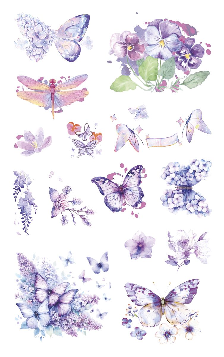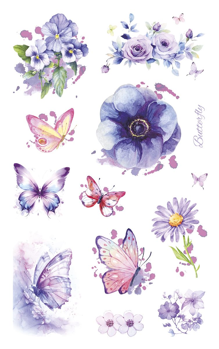 Naklejki foliowe, 4 plansze, wzory: motyle, kwiaty. tonacja fioletowa.