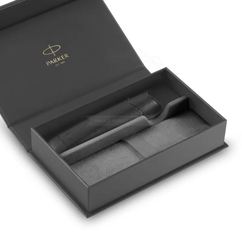 Ładne pudełko prezentowe na produkty piśmiennicze, wraz z czarnym etui w środku. Jest to oryginalne pudełko Parker w srebrnym kolorze, ozdobione dodatkowo obwolutą oraz wygrawerowanym na jego powierzchni logo marki. Pudełko to stanowi ozdobę samą w sobie. Nie wymaga dodatkowego pakowania, podkreślając markę, a tym samym wyjątkowość prezentu.