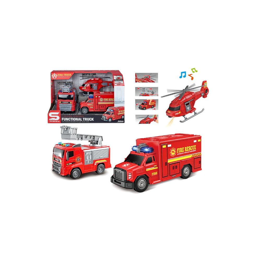 W zestawie: - wóz gaśniczy dł. 18 cm - furgonetka dł. 19 cm - helikopter dł. 20 cm Funkcje: - wóz gaśniczy * napęd frykcyjny * naciśnięcie przycisków aktywuje odgłosy pojazdu i podświetlenie koguta * ruchomy wysięgnik - furgonetka * napęd frykcyjny * naciśnięcie przycisku aktywuje odgłosy pojazdu i podświetlenie koguta - helikopter * naciśnięcie przycisku aktywuje odgłosy pojazdu i przednie światło * ruchome śmigła i drzwi Pozostałe informacje: - wymiary opakowania: 34 x 20,5 x 20 cm - baterie: 9 x AG13 1,5V (po 3 na pojazd) dołączone testowe - wiek: 3+