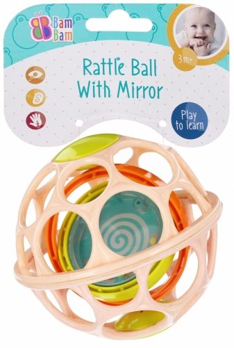 Zalety produktu: Kula z grzechotką Lustro zabawka dla niemowląt BAM BAM. Kolorowa kula z grzechotką i lusterkiem to idealna zabawka dla najmłodszych, która wspiera rozwój zmysłów i koordynacji ruchowej. Dźwięk grzechotki przyciąga uwagę dziecka, a lusterko pozwala na poznawanie własnego odbicia, co wspomaga rozwój świadomości siebie i percepcję wzrokową. Kula wykonana jest z bezpiecznych, lekkich materiałów, łatwa do chwytania i trzymania w małych rączkach. Doskonale sprawdza się jako zabawka stymulująca dla niemowląt w wieku od 3 miesięcy życia. Świetny wybór na prezent dla maluszka, łączący zabawę z edukacją sensoryczną. Cechy produktu: wspiera rozwój zmysłów i koordynację ręka-oko, łatwa do chwytania przez niemowlę, lekkie i bezpieczne materiały. Wymiary/waga/baterie: wymiary produktu (dł. x wys. x gł.)[cm]: 11x11x11, wymiary opakowania (dł. x wys. x gł.)[cm]: 12x19x11, waga produktu bez opakowania [kg]: 0,08 kg, waga produktu w opakowaniu [kg]: 0,08 kg, nie wymaga zasilania bateriami. Grzechotka przeznaczona dla dzieci w wieku: 3m+. Produkt pakowany z zawieszką. Karton zbiorczy 96szt.