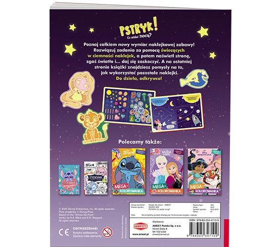 Świat uwielbianych przez dzieci bohaterów Disneya staje się jeszcze bardziej niesamowity! Wszystko dzięki świecącym w ciemności naklejkom, które służą do rozwiązywania zadań. Po naświetleniu strony i zgaszeniu światła dziecko odkrywa nowe, fascynujące, świecące obrazki. W książce znajdują się też pomysły na zabawy z wykorzystaniem tych niezwykłych naklejek. To kto zrobi PSTRYK?